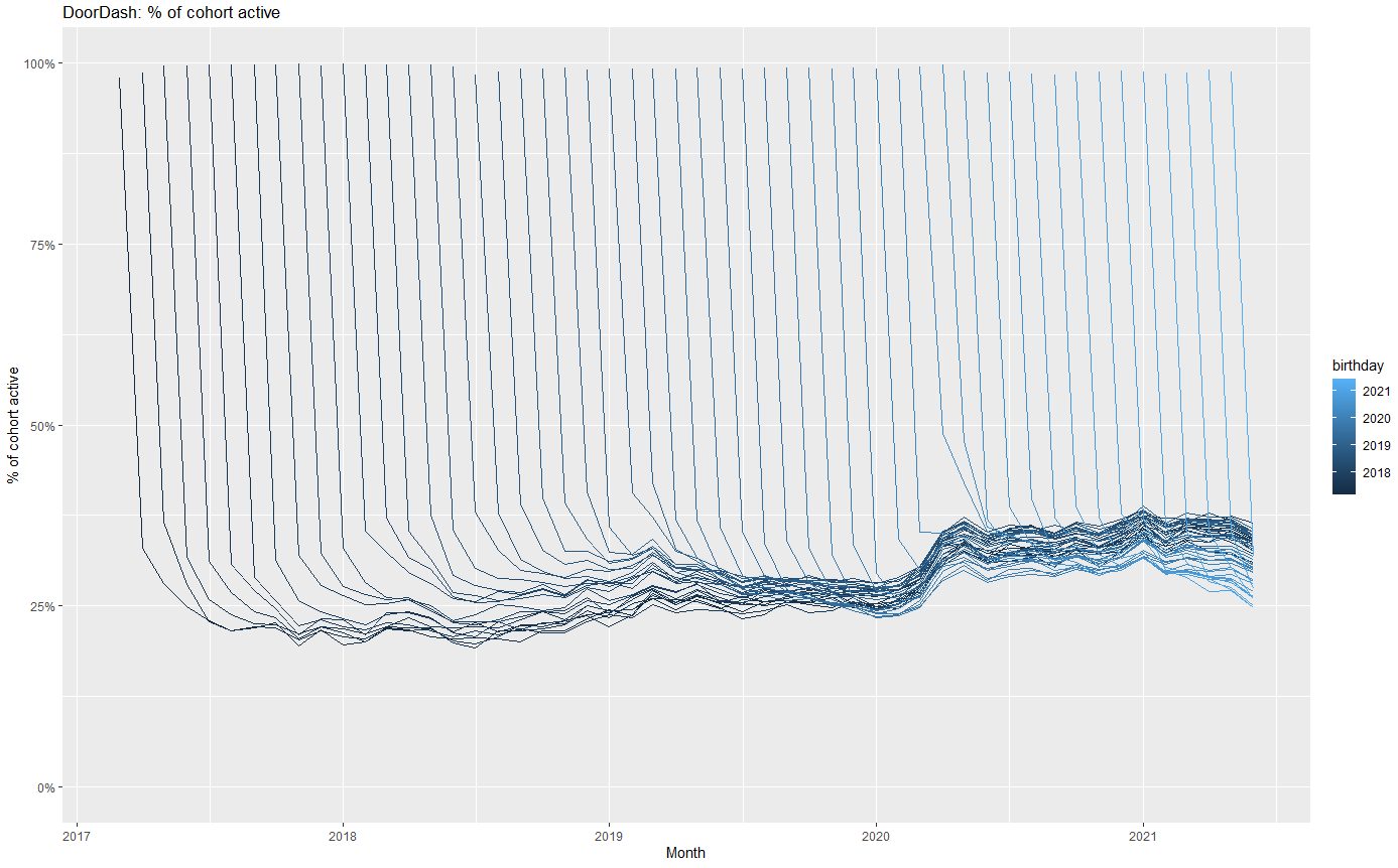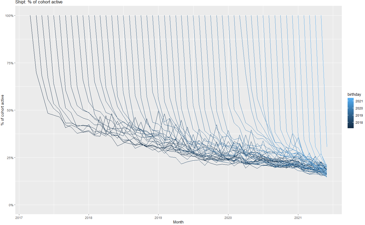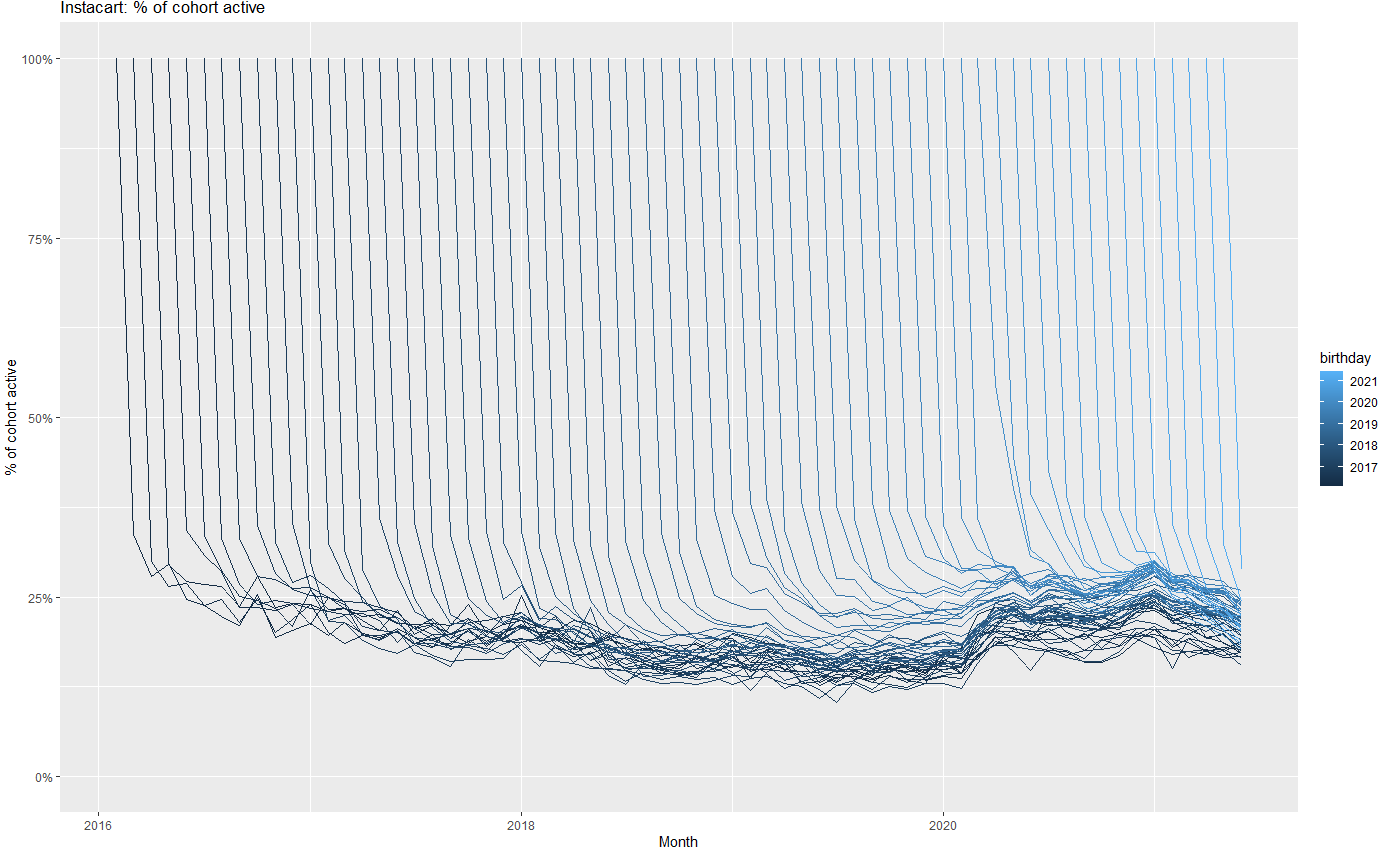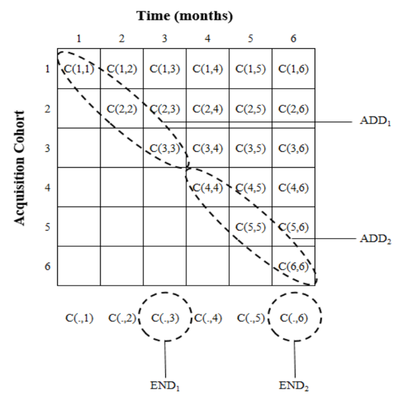 Let \(C(t,t')\) be the number of customers acquired in time \(t\) & still active in time \(t'\ge t\)